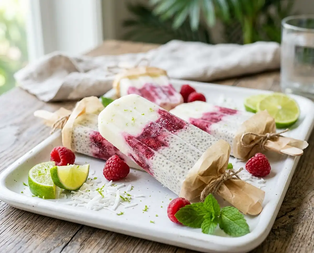 Well… those dairy-free gluten-free coconut lime chia pudding pops became the hit of the party, with kids asking for seconds and parents requesting the recipe before they’d even finished their first one. The combination of creamy coconut milk, bright lime zest, and tiny chia seeds creates a texture that’s somewhere between a creamsicle and a sophisticated paleta—each bite delivers tropical flavor with little pops of texture from the chia seeds. The layered effect with crushed raspberries makes them look bakery-fancy, but the whole process is literally just shaking jars and spooning mixtures into molds.