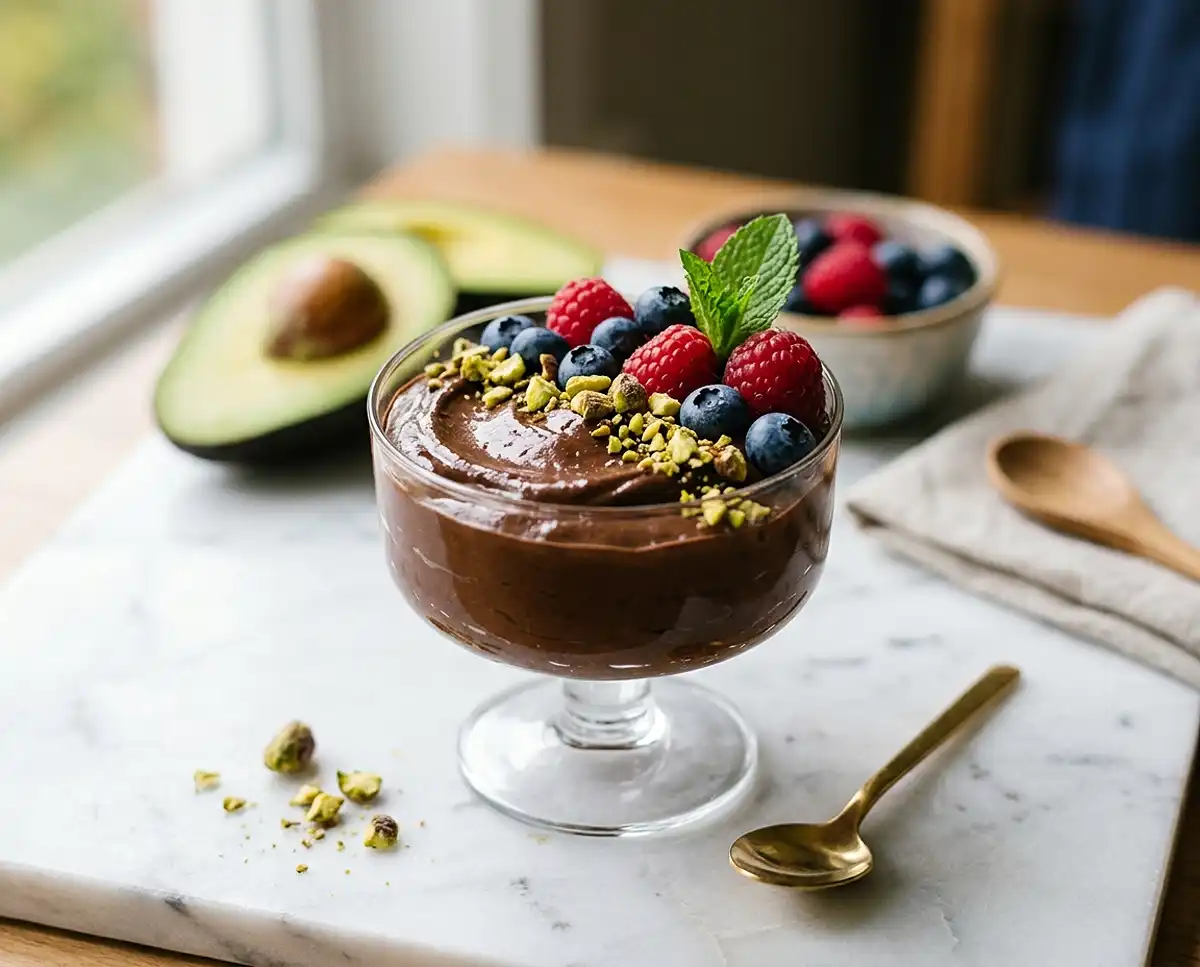 Serve this dairy-free chocolate avocado mousse as a light finish to Thanksgiving dinner when everyone’s too full for heavy pie, or bring it to summer potlucks where you need a dessert that can sit in a cooler without melting. The combination of rich chocolate, tart berries, and crunchy pistachios makes every bite interesting, and the naturally gluten-free, dairy-free profile means almost everyone at the table can enjoy it.