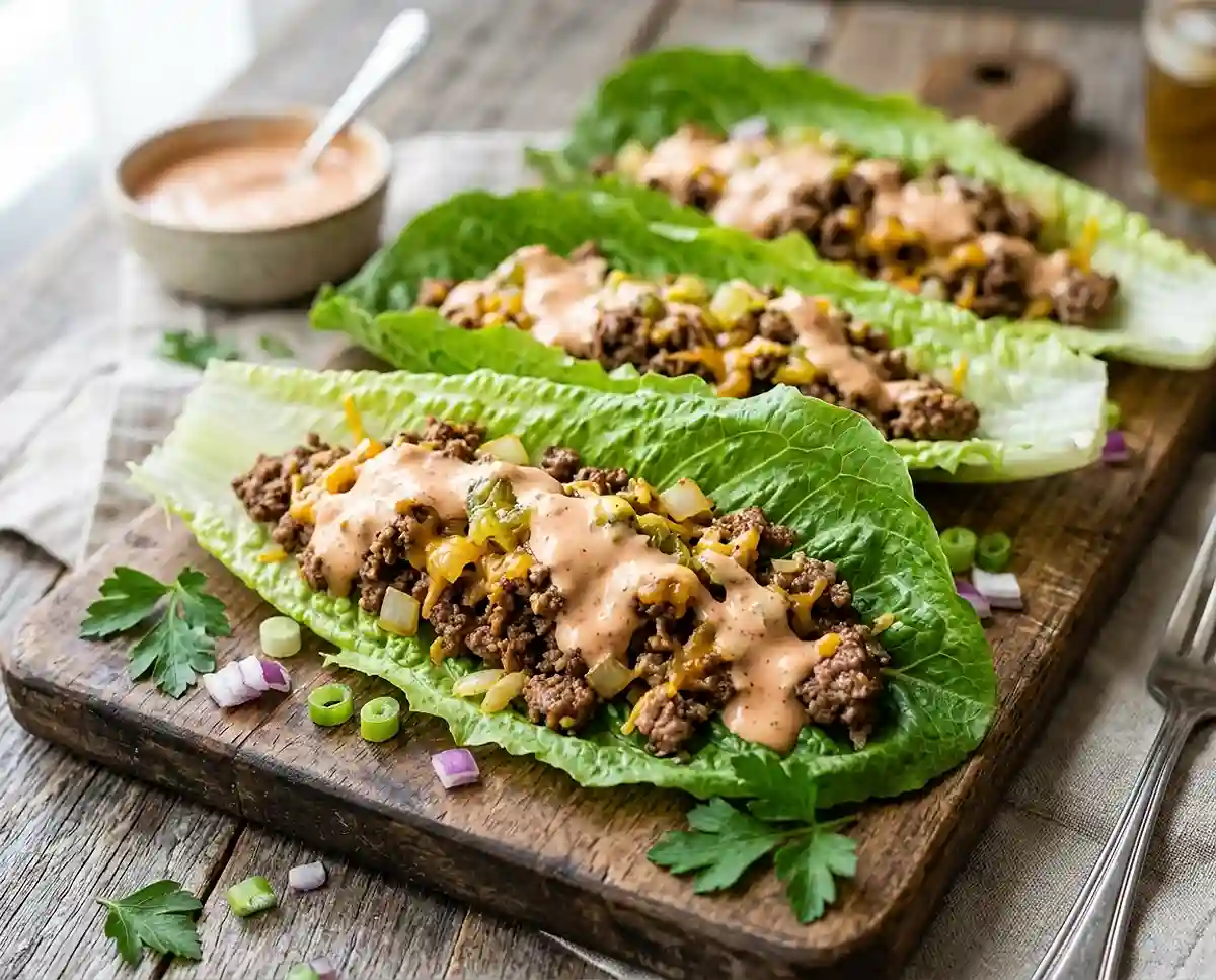 Absolutely—set up a “build your own burger wrap” bar with the hot beef filling in a slow cooker or warming dish, the secret sauce in a bowl, and a platter of romaine leaves. Add optional toppings like shredded cheese, diced tomatoes, avocado slices, and pickles so guests can customize their own wraps. This interactive format is perfect for casual gatherings and accommodates different dietary preferences easily.