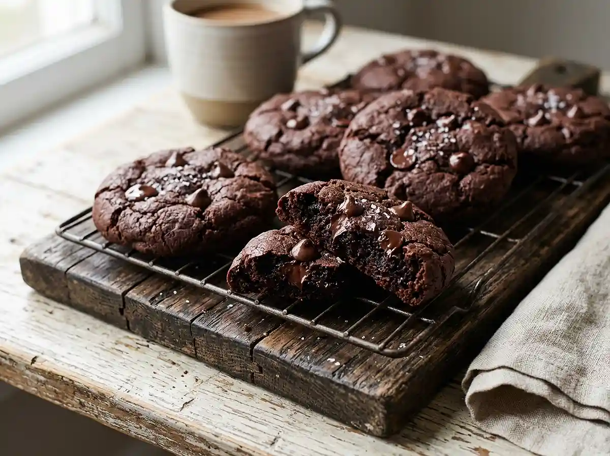 Let the cookies rest on the baking sheet for at least 5 minutes — this is where they firm up and develop that perfect chewy-fudgy texture. Transfer to a wire rack to cool completely, though I’d be lying if I said I don’t sneak one while they’re still warm. The chocolate chips will be pooling in glossy little rivers, and the cookie itself will have a density that’s somewhere between a brownie and a truffle — rich, dark, and deeply satisfying.