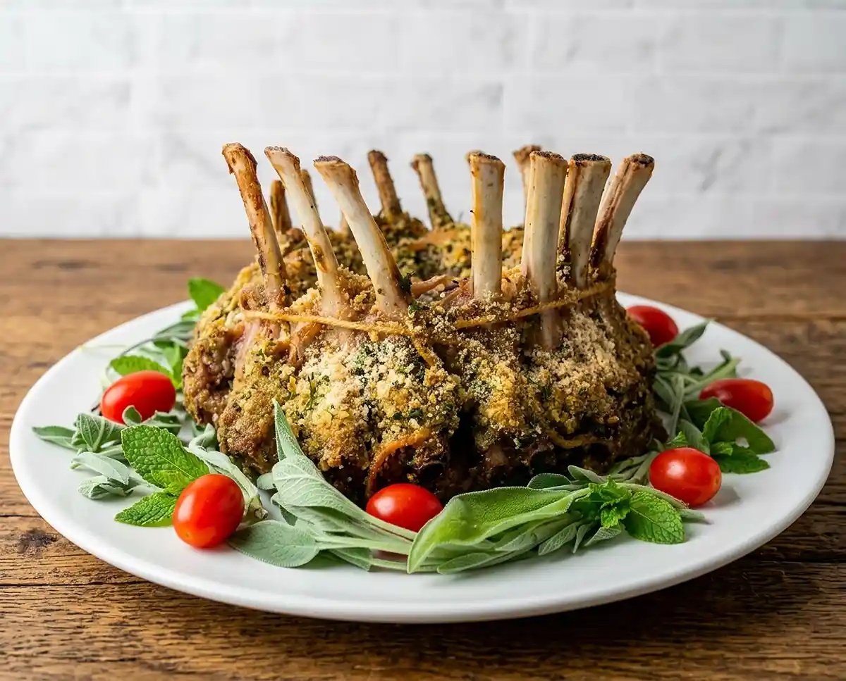No, you can’t form a crown with leg meat—it’s a completely different cut. Racks have those exposed rib bones that create the crown structure. If you want to use this herb crust on a leg of lamb, butterfly the leg, apply the rub and crust, then roast it flat. Cooking time will be longer (60-75 minutes depending on size).