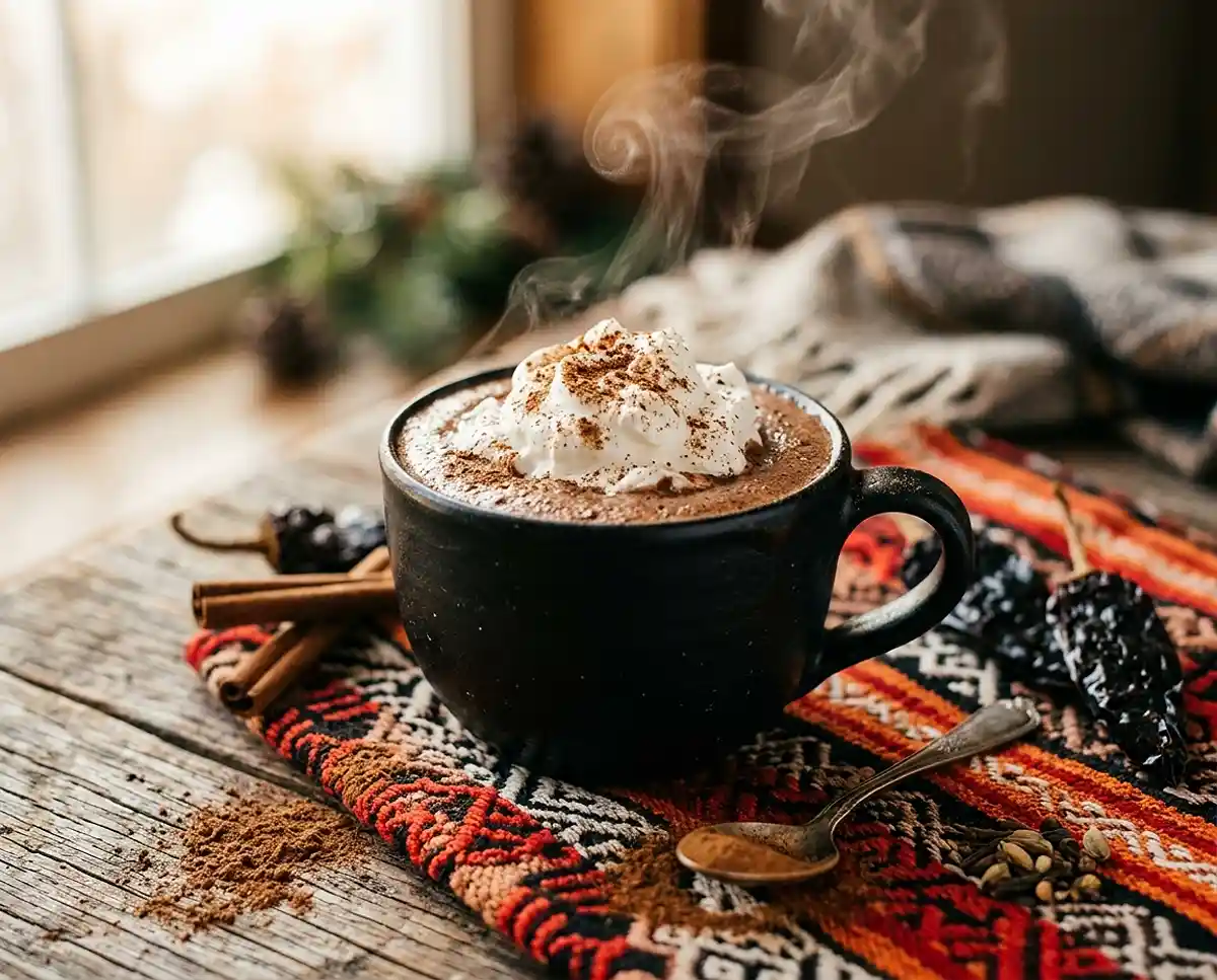 Mexican hot chocolate features cinnamon as a signature spice, often includes chili for warmth, and traditionally has a slightly grainier texture from tablet chocolate whisked vigorously. The spiced cocoa profile is warmer and more complex than typical American hot cocoa.