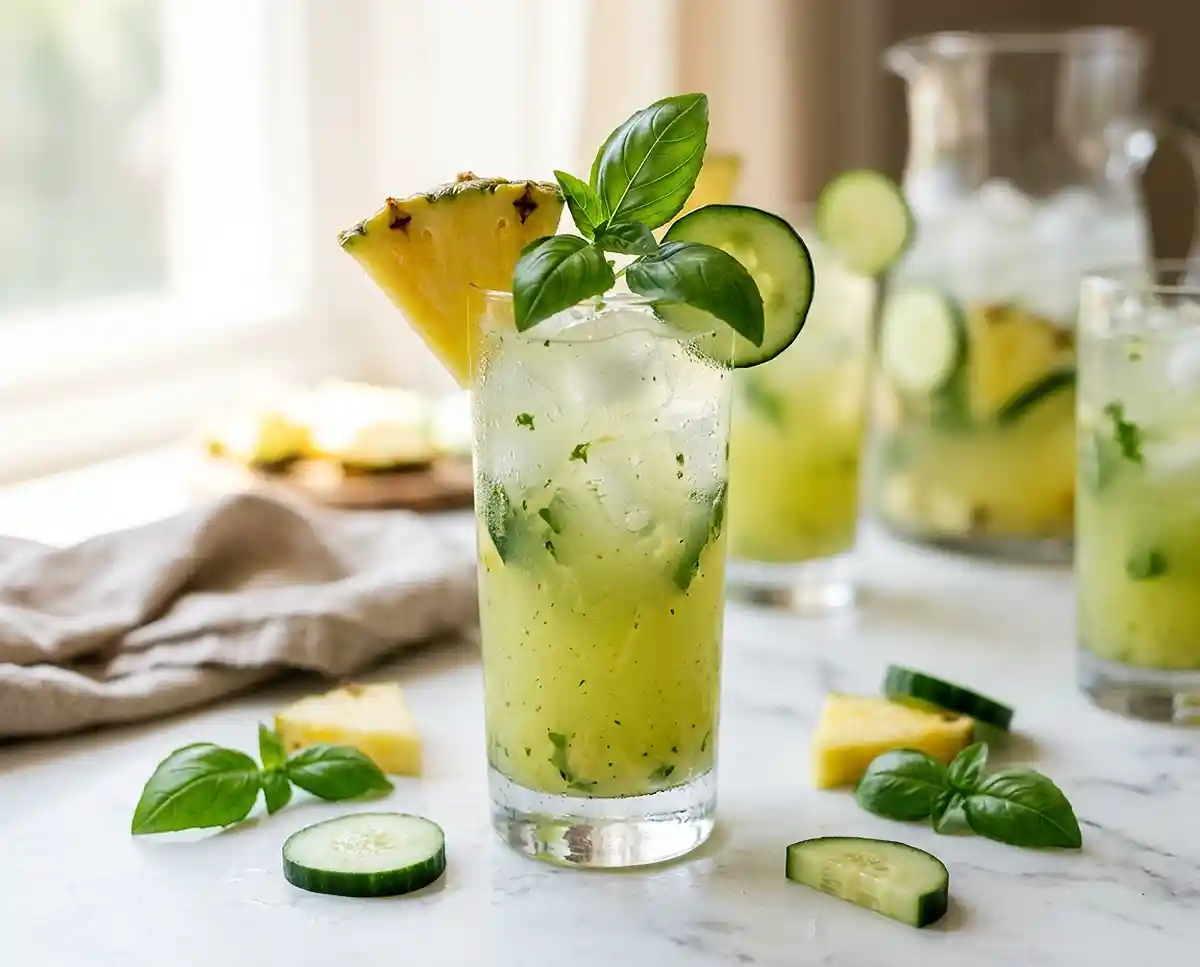 Gluten-free pineapple cucumber refresher with fresh basil—a hydrating summer sip that’s naturally dairy-free and allergy friendly. Ready in just 10 minutes!