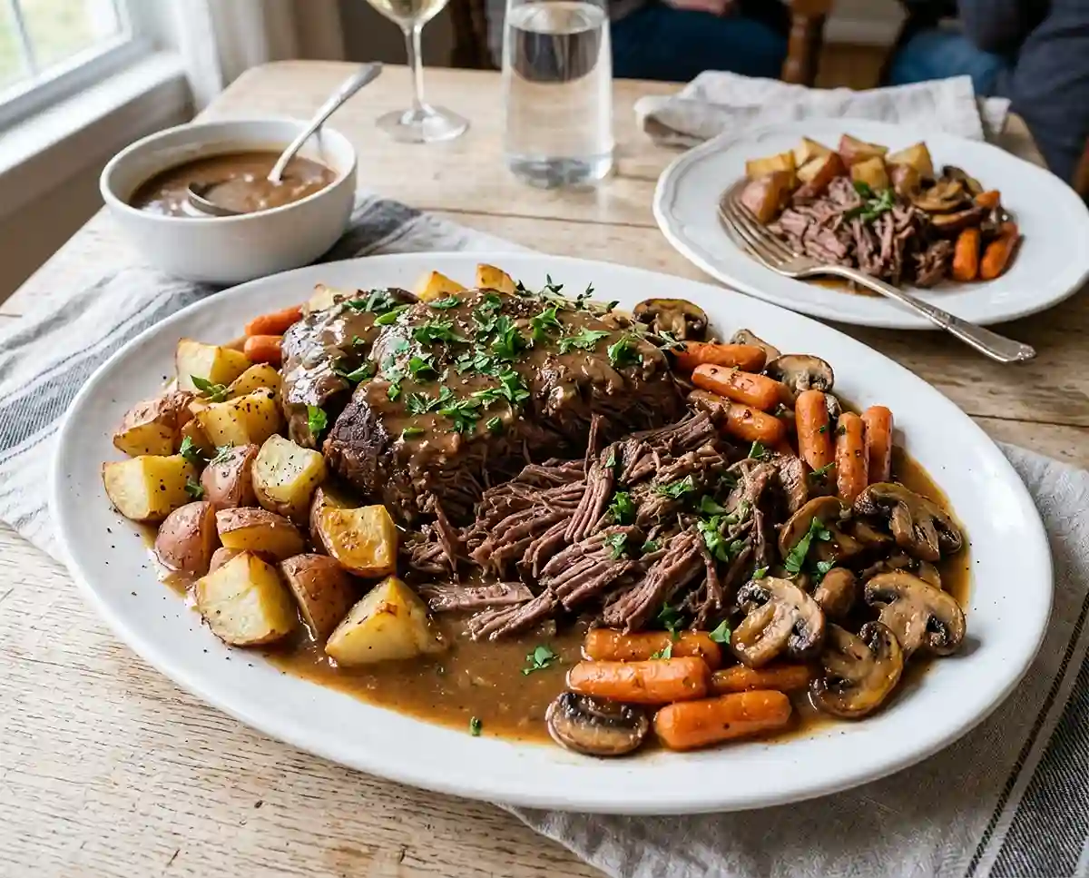 This melt-in-your-mouth gluten-free pot roast cooks low and slow with veggies and rich mushroom gravy. Ultimate comfort food for busy families! (156 characters)
