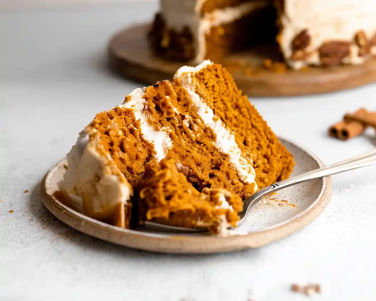 Step 11: Once your gluten free pumpkin cake layers are completely cool (patience, friend—warm cake equals melty frosting disaster), frost generously between layers and all over the top and sides. For an extra touch of fall magic, drizzle with homemade caramel and sprinkle crushed pecans on top.