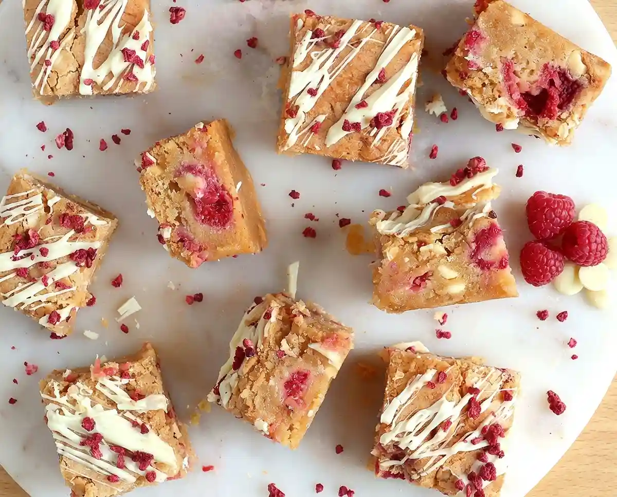 Fresh raspberries work best for this recipe. Frozen berries contain too much moisture and will bleed into the batter, creating a soggy texture and turning the blondies purple. If fresh aren’t available, consider using freeze-dried raspberries instead—they add intense flavor without excess moisture.