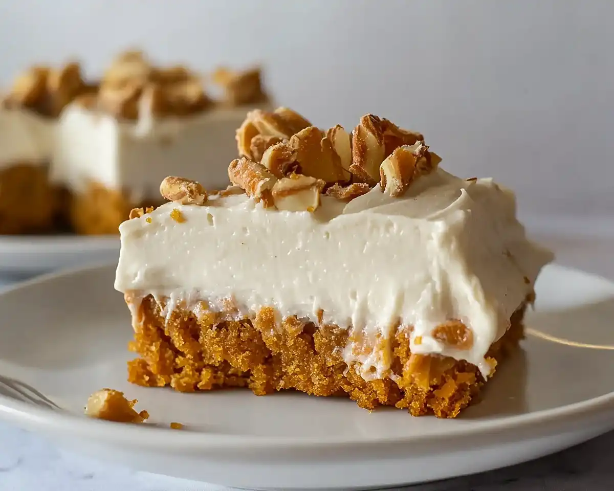 - Spread the cream cheese topping evenly over the pressed carrot base using an offset spatula or the back of a spoon. Sprinkle about 1/4 cup of chopped walnuts on top for that classic carrot cake look and a satisfying crunch.