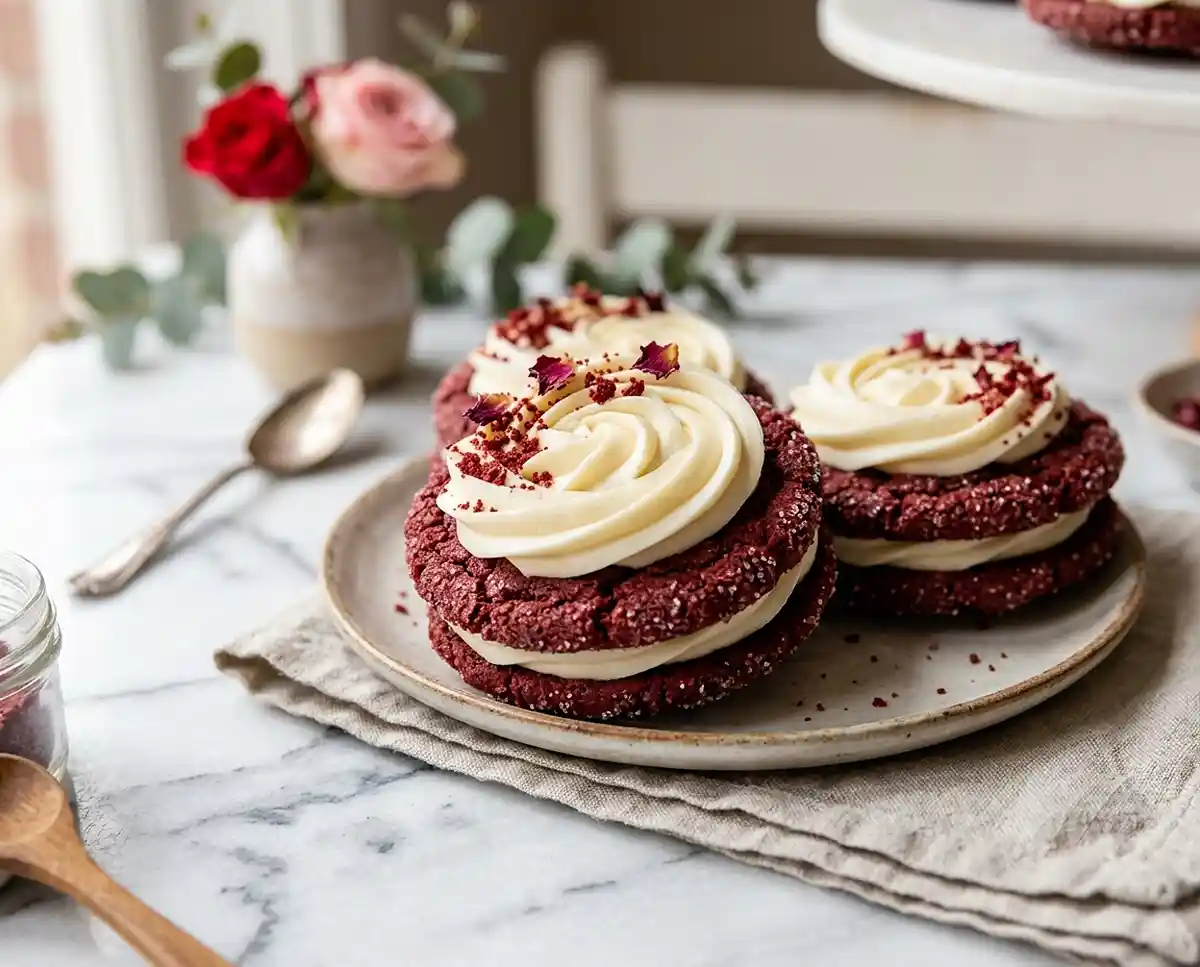 These gluten-free red velvet cookies are absolute showstoppers on a Valentine’s Day dessert platter or Christmas cookie exchange—the red color and white frosting swirl make them impossibly festive without any extra decoration. Pair them with a simple dairy-free matcha ice cream for a sophisticated flavor contrast, or serve alongside savory bites like gluten-free bacon wrapped dates for a party spread that covers all the cravings.