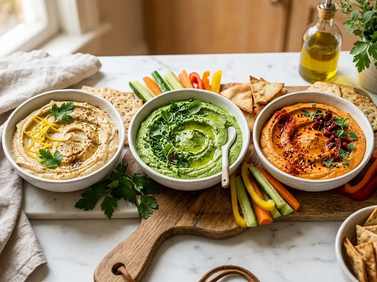 Spoon each chickpea dip into its own bowl and add the finishing touches. Top the Lemon & Cumin Hummus with a sprinkle of extra lemon zest and a pinch of ground cumin. Crown the Green Herb Hummus with finely chopped parsley, cilantro, and chives. Finish the Sundried Tomato & Paprika Hummus with a dusting of paprika and a tiny pinch of chili flakes. A drizzle of good olive oil over each one ties the whole mediterranean dip platter together beautifully.