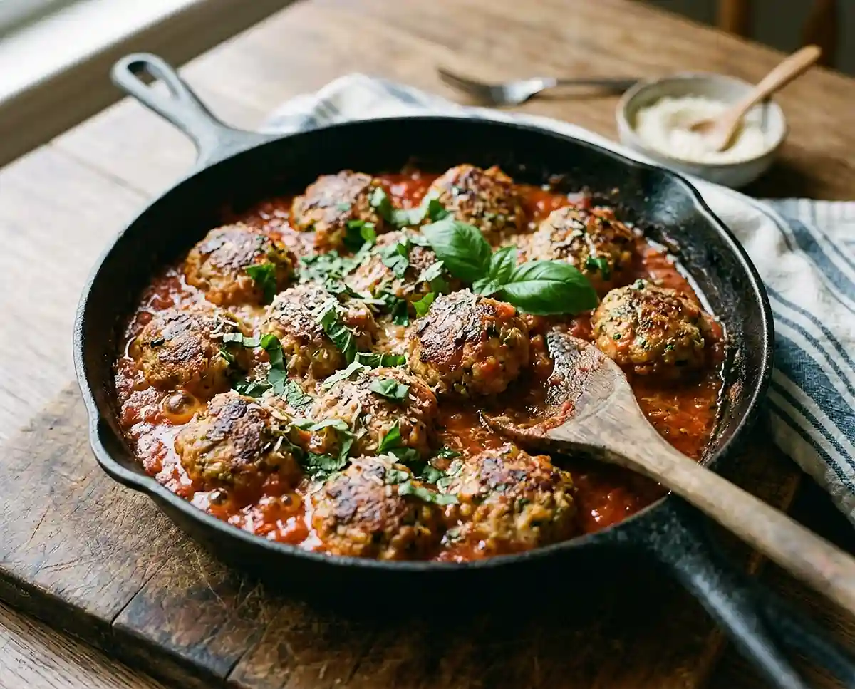 Gluten-free turkey meatball skillet with fresh herbs ready in 30 minutes. Tender, flavorful meatballs in tomato sauce—perfect for meal prep or busy weeknights.