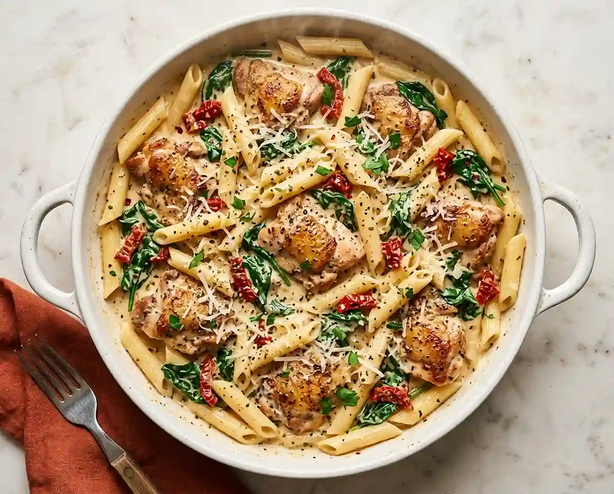 Well… I’d been craving something that tasted rich and indulgent without actually being complicated to pull together. This creamy sundried tomato pasta hit every note. The sauce coats each piece of chicken in velvety, garlicky goodness, the spinach wilts right in, and the whole thing tastes like it came from a cozy trattoria somewhere in the Italian countryside.