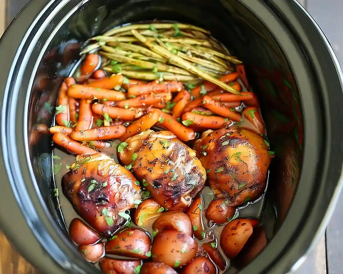 - Grab your 6-quart slow cooker and add the chicken thighs first, arranging them skin-side up in a single layer if possible. Add your halved baby red potatoes and baby carrots around and between the chicken pieces. Pour your prepared sauce evenly over everything, making sure the chicken and vegetables get coated thoroughly.
